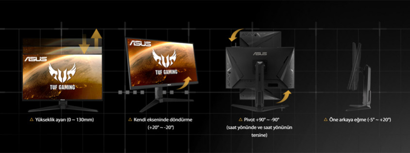 Ergonomik bir standa sahip olan TUF Gaming VG27AQL1A, eğme, döndürme, çevirme ve yükseklik ayarı ile en ideal pozisyonu kolayca bulmanızı sağlar. Ekran ayrıca duvar montajı için VESA uyumludur.- Yükseklik ayarı (0 ~ 130mm)