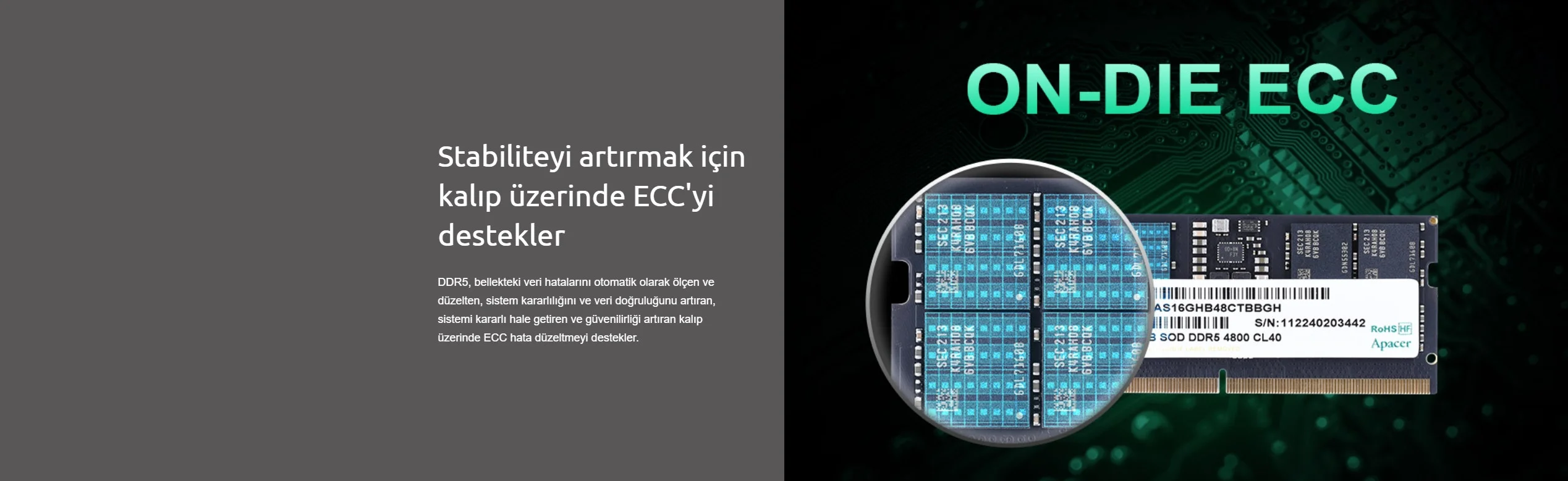DDR5, bellekteki veri hatalarını otomatik olarak ölçen ve düzelten, sistem kararlılığını ve veri doğruluğunu artıran, sistemi kararlı hale getiren ve güvenilirliği artıran kalıp üzerinde ECC hata düzeltmeyi destekler.