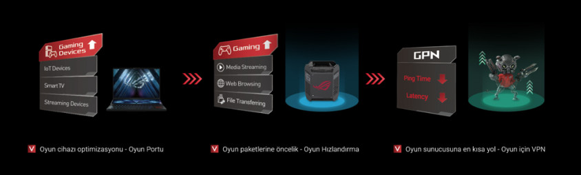 - Yüksek Verimlilik Performansı – Özel yüksek performanslı ana taşıyıcıya ve 10.000 Mb/sn'ye varan ultra yüksek hızlar sağlayan 160 MHz kanallara sahip WiFi 6 üç-bant ağ oyun sistemi.