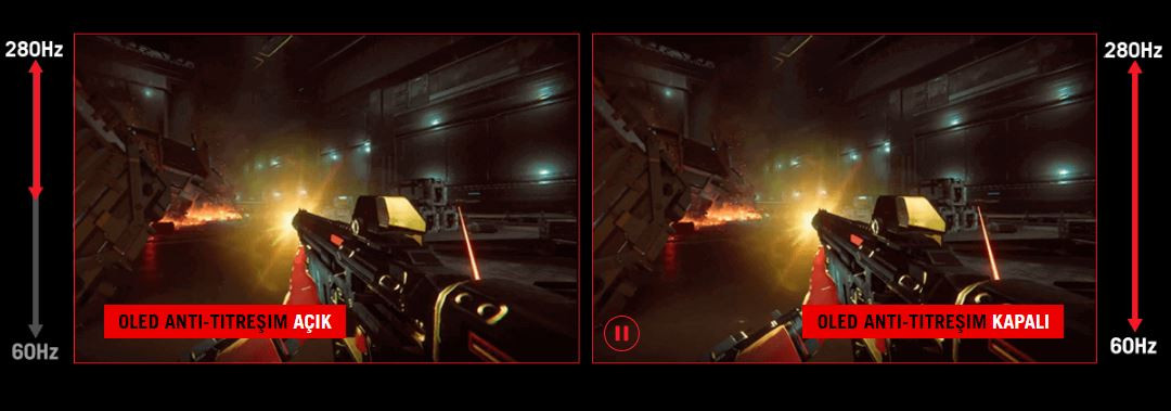 ROG'a özel OLED Anti-Flicker teknolojisi, kare hızı dalgalanmaları sırasında titreşimi azaltmak ve sürükleyici bir oyun deneyimi sağlamak için üç yenileme hızı aralığı sunar: Yüksek, Orta, Kapalı.