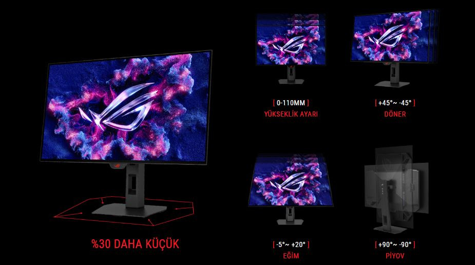 Yeni ROG Strix OLED serisi monitörler, önceki nesil XG monitörlerde bulunanlardan %30 daha küçük, yeni ve kompakt bir standa sahip. Bu stand, klavye ve fare için değerli bir masa alanı sağlıyor. Stand, ideal izleme pozisyonu için eğme, döndürme ve yükseklik ayarları sunuyor. Ekran ayrıca VESA duvar montajına da uyumlu.