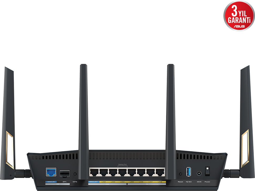 Asus RT-BE88U Router, toplamda 8 adet Ethernet portu sunar ve bu portlar arasında hem RJ45 hem de SFP+ (10 Gb) seçenekleri bulunur. 4xRJ45 (1Gb), 3xRJ45 (2.5Gb) ve 1xSFP+ (10Gb) portları ile yüksek hızlı kablolu bağlantılar sağlar. Bu sayede masaüstü bilgisayarlar, oyun konsolları ve medya sunucuları gibi cihazlarınızı doğrudan ve hızlı biçimde ağa dahil edebilirsiniz. Çoklu WAN desteği ile farklı internet bağlantılarını aynı anda yönetmek mümkündür. Gelişmiş kablolu bağlantı özellikleri, büyük veri transferlerinde performanstan ödün vermeden çalışmanızı sağlar.