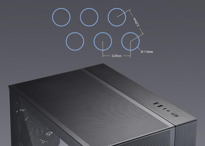 Lian Li O11 Air Mini’nin mesh tasarıma sahip ön, üst ve yan panelleri, kasanın farklı taraflarından sabit ve düşük sıcaklıklara maksimum hava akışına izin verecek şekilde optimize edilmiştir. Hassas işçiliğe sahip bu mesh tasarım, kasanın içinde toz birikmesini önlemek için toz filtresi görevi de görür.