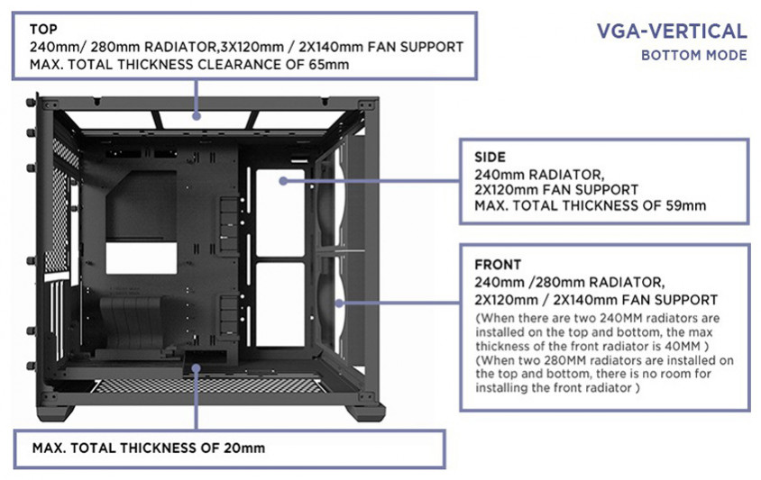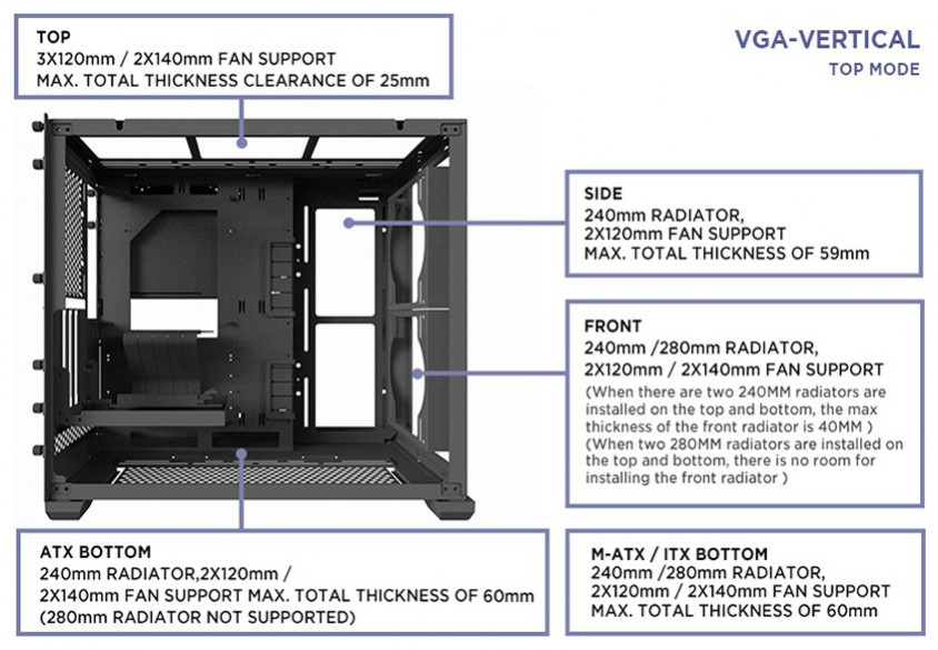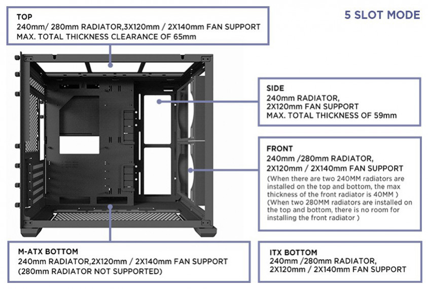 - M-ATX / ITX Alt: 240mm/280mm radyatör desteği / 2x120mm/2x140mm fan desteği / 60mm maks. toplam kalınlık açıklığı