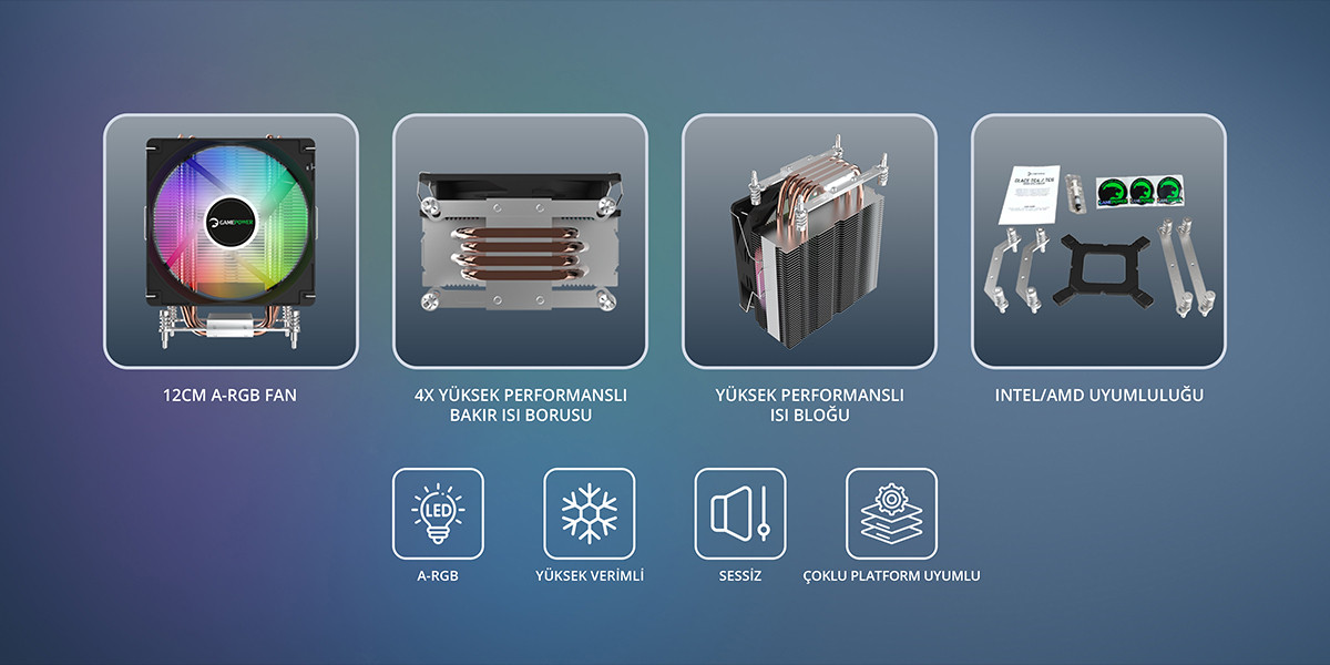 4 Adet yüksek performanslı bakır ısı borusu, A-RGB yüksek verimli, Sessiz ve çoklu platformlarda uyumlu.