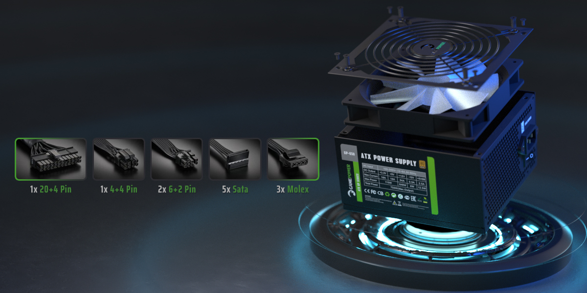20+4 Pin Ana Konektör, 4+4 Pin 12V Konektör, Molex Konektör ve 5X Sata ile birlikte Gamepower GP-650, OVP / UVP / OPP / SCP / SIP fonksiyonlarınıza full koruma sağlar.