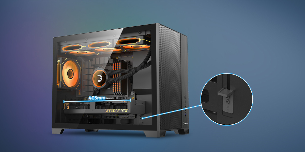 Kasa içinde yer alan dahili ekran kartı destek aparatı, ağır ve uzun GPU’lar için ekstra denge sağlar. Donanımın zamanla sarkmasını önleyerek sistem güvenliğini artırır.