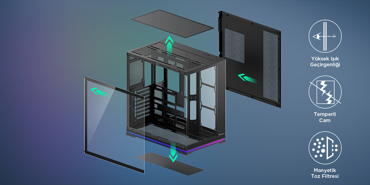 Yüksek ışık geçirgenliğine sahip temperli cam paneller sisteminizi şık şekilde sergiler; manyetik toz filtresi ise kolay bakım ve uzun ömürlü bir yapı sunar.