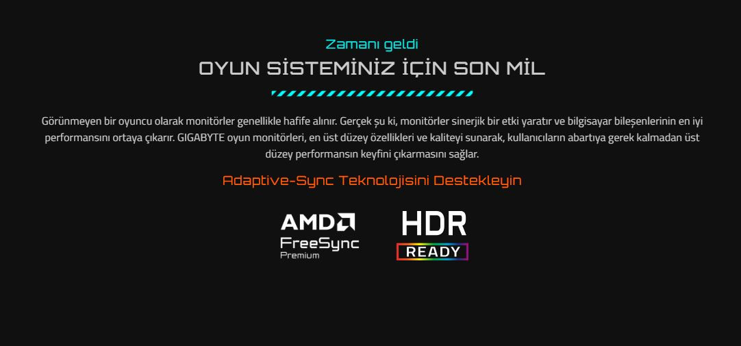Görünmeyen bir oyuncu olarak monitörler genellikle hafife alınır. Gerçek şu ki, monitörler sinerjik bir etki yaratır ve bilgisayar bileşenlerinin en iyi performansını ortaya çıkarır. GIGABYTE oyun monitörleri, en üst düzey özellikleri ve kaliteyi sunarak, kullanıcıların abartıya gerek kalmadan üst düzey performansın keyfini çıkarmasını sağlar.Adaptive-Sync Teknolojisini Destekler