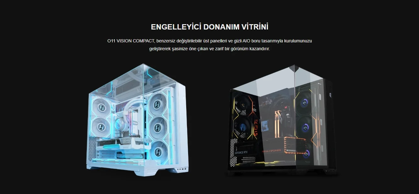 O11 VISION COMPACT, benzersiz değiştirilebilir üst panelleri ve gizli AIO boru tasarımıyla kurulumunuzu geliştirerek şasinize öne çıkan ve zarif bir görünüm kazandırır.