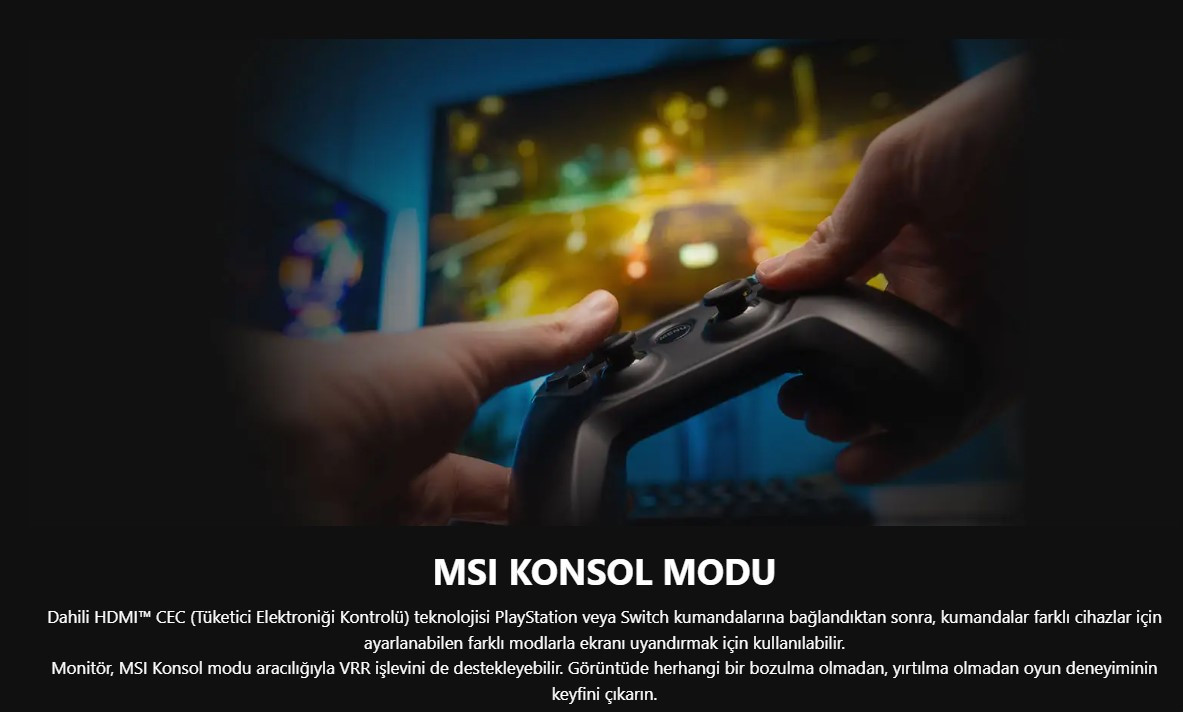 MSI MAG 244F monitör, konsol kullanıcıları için de optimize edilmiş bir deneyim sunar. 1920x1080 @ 120Hz konsol desteği ile oyunlarda yüksek performans sağlar. AMD FreeSync Premium teknolojisi, ekran yırtılmalarını ve gecikmeleri ortadan kaldırır. Oyun severler, hızlı ve akıcı bir görüntü ile rekabette avantaj elde eder. Konsol ve PC uyumluluğu ile çok yönlü kullanım mümkündür.