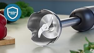 - Paslanmaz çelik bıçaklar, uzun ömürlü ve etkili doğrama-karıştırma işlemleri için tasarlanmıştır.