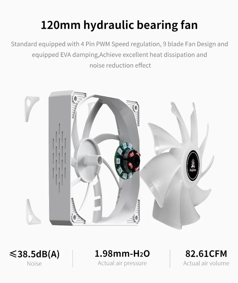 Standart olarak 4 Pin PWM hız ayarı, 9 kanatlı fan tasarımı ve donanımlı EVA sönümleme ile donatılmıştır, Mükemmel ısı dağılımı ve gürültü azaltma etkisi sağlar.