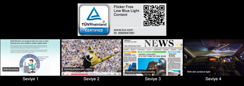 - ASUS Eye Care monitörler rahat bir izleme deneyimi sunmak için TÜV Rheinland sertifikalı Flicker-free ve Düşük Mavi Işık teknolojilerine sahiptir.