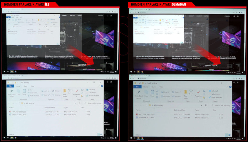 Ekran menüsündeki ROG'ye özel Homojen Parlaklık ayarı etkinleştirildiğinde, parlak beyaz pencerelerin boyutunu değiştirirken bile daha iyi izleme deneyimi için parlaklık seviyelerini kararlı bir düzeyde tutmak amacıyla maksimum parlaklığı azaltır. Ayrıca oyun maratonlarının gözler için çok daha rahat olmasını sağlar.