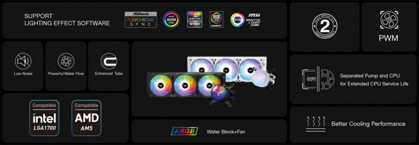 Yüksek güçte üç adet ARGB fanlarının yanı sıra siyah ve beyaz olmak üzere iki farklı renk seçeneğine sahip olan T-Force Siren GD360E AIO soğutucu, tüm dikkatleri üzerine çekmeye hazır. Asus Aura Sync, ASRock-Polychrome Sync, Biostar Advanced Vivid LED DJ, Gigabyte RGB Fusion 2.0 ve MSI Mystic Light desteğine sahip olan Siren GD360E ile kendi çarpıcı aydınlatma efektlerinizi özelleştirin.
