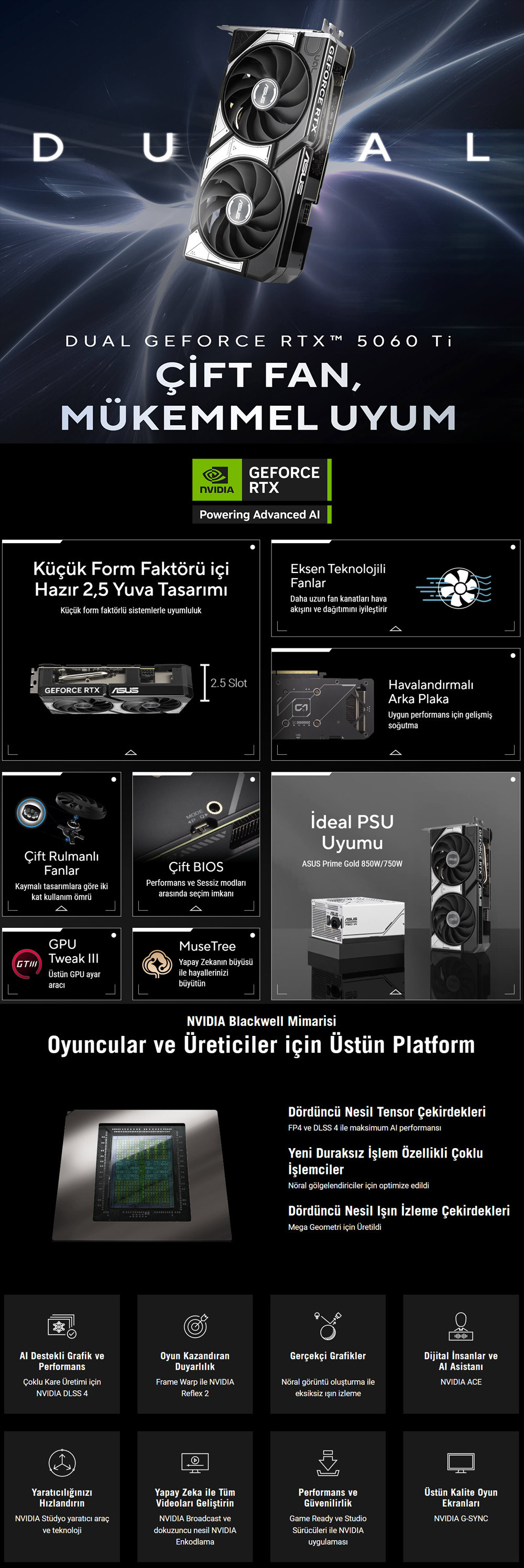 ASUS Dual GeForce RTX™ 5060 Ti, geniş uyumlulukla birlikte dinamik soğutma performansı ortaya koyar. Amiral gemisi ekran kartlarındaki gelişmiş soğutma çözümlerinde de yer alan iki adet eksen teknolojili fan, soğutma bloğuna giden hava akışını optimize eder. 2,5 yuva kaplayan form faktörüyle, daha az alanda daha fazla güç sunar. Bu geliştirmeler ASUS Dual’ı, kompakt sistemlerde yüksek grafik performansı isteyen oyuncular için mükemmel hale getirir.