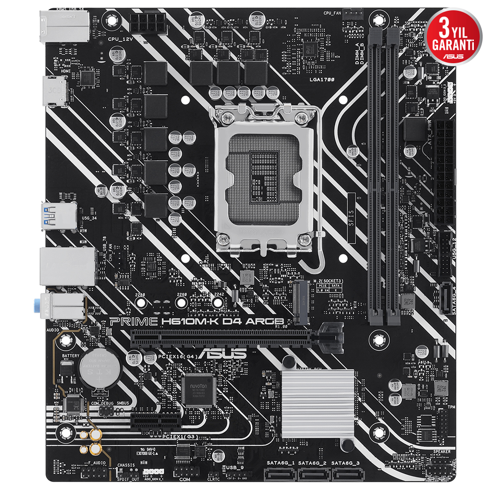 ASUS Prime H610M-K D4 LGA 1700 anakart, HDMI 2.1, D-Sub (VGA), PS/2, 6 adet USB Type-A (2x USB 3.2 Gen 1, 4x USB 2.0), LAN (RJ45) ve üç ses jakı ile çok sayıda bağlantı seçeneği sunar. PCIe 4.0 x16 ve PCIe 3.0 x1 slotları, ekran kartı ve genişletme kartları için yüksek hızda veri transferi sağlar. 1 adet M.2 ve 4 adet SATA 3.0 portu, depolama çeşitliliği ve hızlı veri aktarımı imkanı tanır. Bu sayede farklı donanımlar ve çevre birimleriyle maksimum uyumluluk elde edilir.