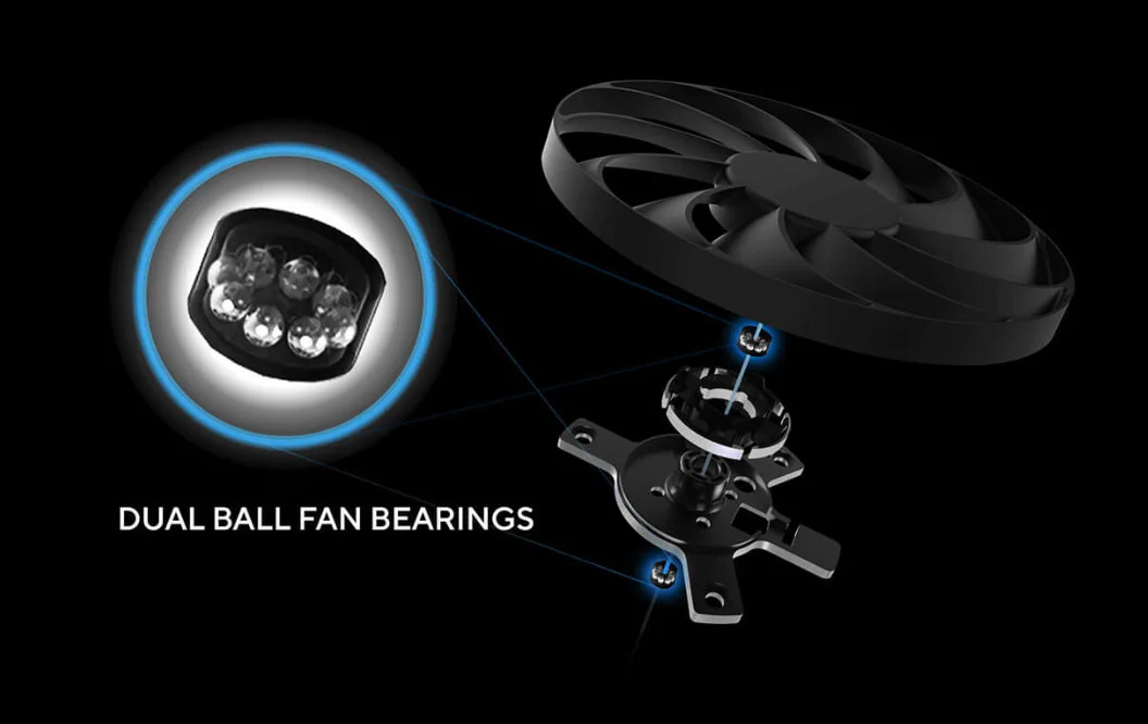 Performansı kanıtlanan üç adet eksen teknolojili fan, daha düşük sıcaklıklar, daha az gürültü ve daha yüksek performans için daha uzun kanatlara yer verebilen küçük bir yuvaya ve aşağı yönlü hava basıncını artıran bir bariyer halkasına sahip.