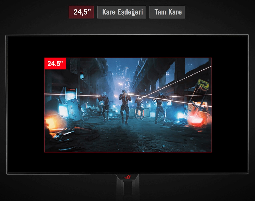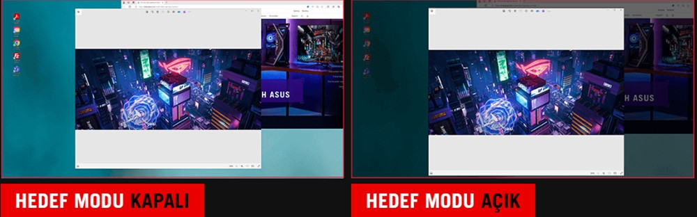 Ekran menüsündeki ROG'ye özgü Homojen Parlaklık* ayarı etkinleştirildiğinde beyaz pencerelerin boyutu değiştirilirken bile daha iyi izleme deneyimi için maksimum parlaklık seviyesi azaltılır. Ayrıca oyun maratonlarının gözler için çok daha rahat olmasını sağlar.
