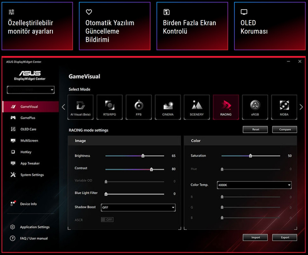 - Özel ASUS DisplayWidget Center, mouse ile monitör ayarlarını değiştirmenin yanı sıra OLED Care Pro işlevlerine de ulaşma imkanı sunar.