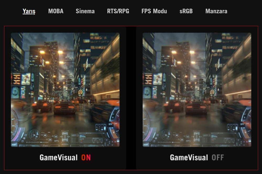 ASUS GameVisual teknolojisinde farklı tür içeriklerdeki görüntüleri optimize etmek için önceden ayarlanmış yedi adet ekran modu bulunur. Bu benzersiz ayarlara kısayol tuşu veya ekran menüsünden kolayca erişilebilir.