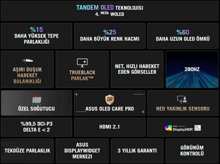 - Önceki nesil WOLED panellere kıyasla %15 daha yüksek tepe parlaklığı, %25 daha büyük renk hacmi ve %60 daha uzun OLED ömrü sağlayan yeni Tandem OLED teknolojisi