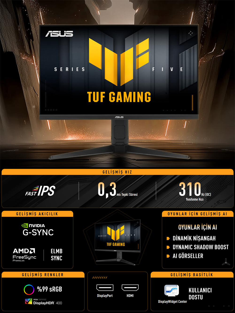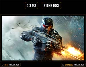 - 310 Hz yenileme hızı ve 0.3 ms tepki süresi ile hızlı refleks gerektiren oyunlarda avantaj sağlar.