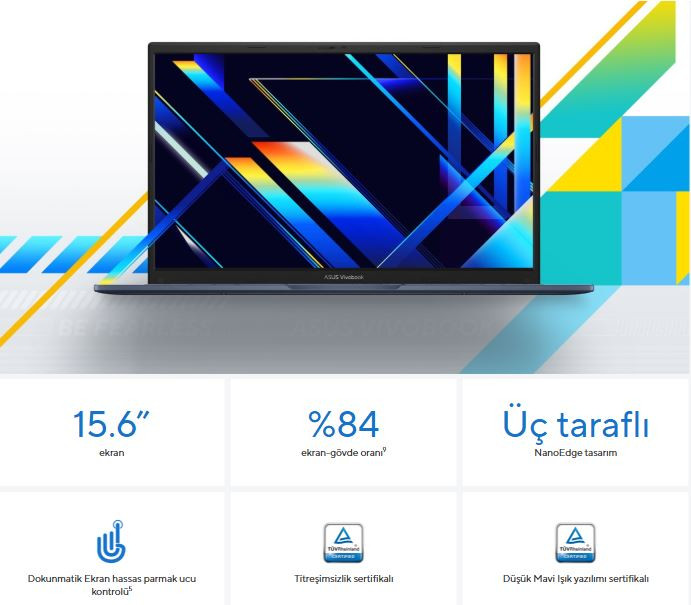 Vivobook 15, üç tarafı ince çerçeveli NanoEdge dokunmatik ekranıyla güzel ve net görseller sunar.5 Geniş izleme açıları, merkez dışı izleme için bile mükemmel kaliteyi korur ve TÜV Rheinland göz sağlığı sertifikası, uzun izleme seanslarında göz yorgunluğu riskini azaltan düşük mavi ışık seviyeleri sağlar.