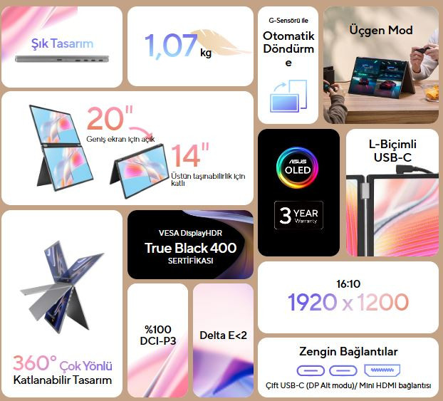 ASUS ZenScreen Duo OLED MQ149CD 360° Katlanabilir Taşınabilir Monitör - Çift 14-inç, 16:10, 1920x1200 FHD, OLED panel, DisplayHDR™ 400 True Black, %100 DCI-P3, Delta- 1920 x 1200 çözünürlük ve 16:10 en-boy oranına sahip çift 14-inç OLED panel 20 inçlik çalışma ortamı sağlar.