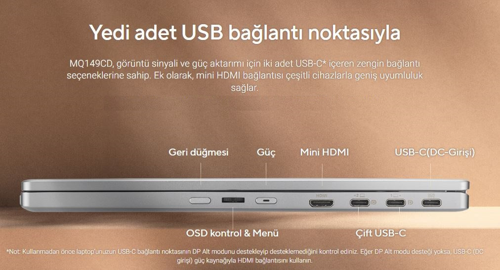 MQ149CD, görüntü sinyali ve güç aktarımı için iki adet USB-C* içeren zengin bağlantı seçeneklerine sahip. Ek olarak, mini HDMI bağlantısı çeşitli cihazlarla geniş uyumluluk sağlar.İlginizi Çekebilecek Diğer Ürünler