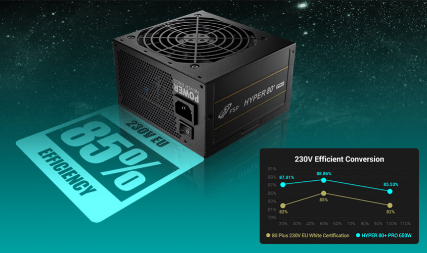 80 Plus 230V EU White sertifikalı Hyper 80+ Pro serisi, %82’ye varan yüksek verimi ile enerji tasarrufu sağlar ve %85’e varan yüksek verimi ile standardı aşar.
