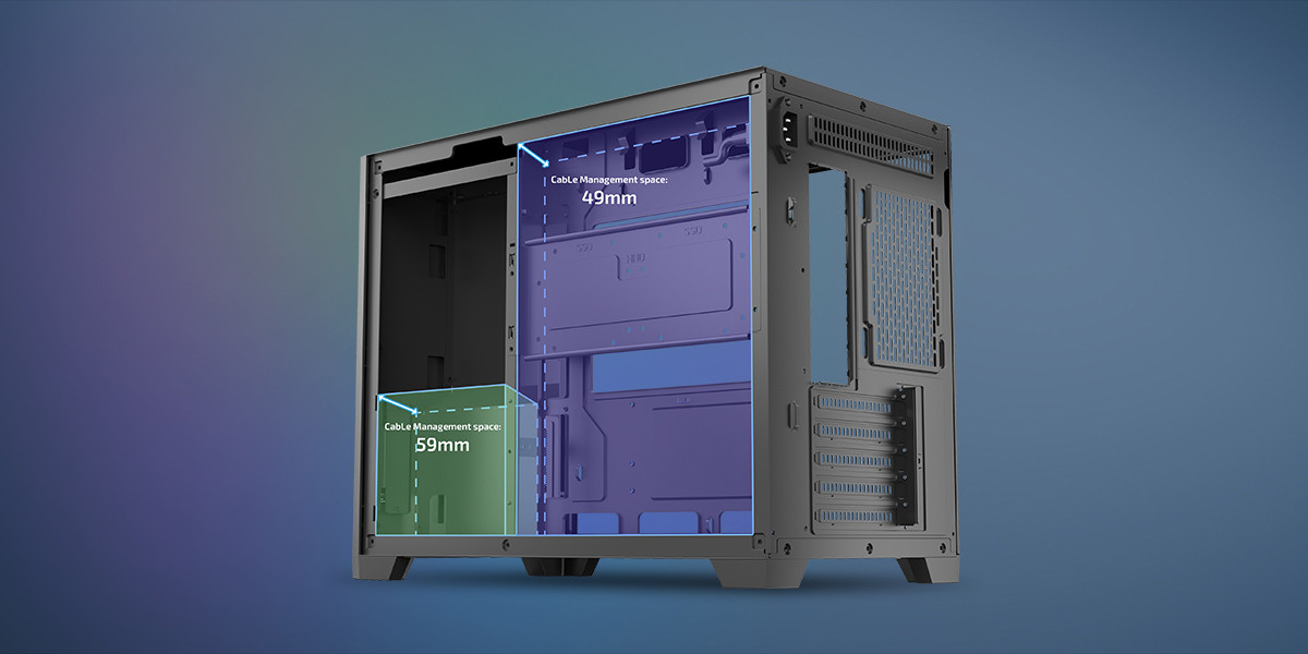 Kasanın arka bölümünde ayrılan geniş kablo yönetim alanı, karmaşayı ortadan kaldırarak temiz ve düzenli bir kurulum sağlar. Daha ferah bir iç yapı ve daha iyi hava akışı elde edilir.