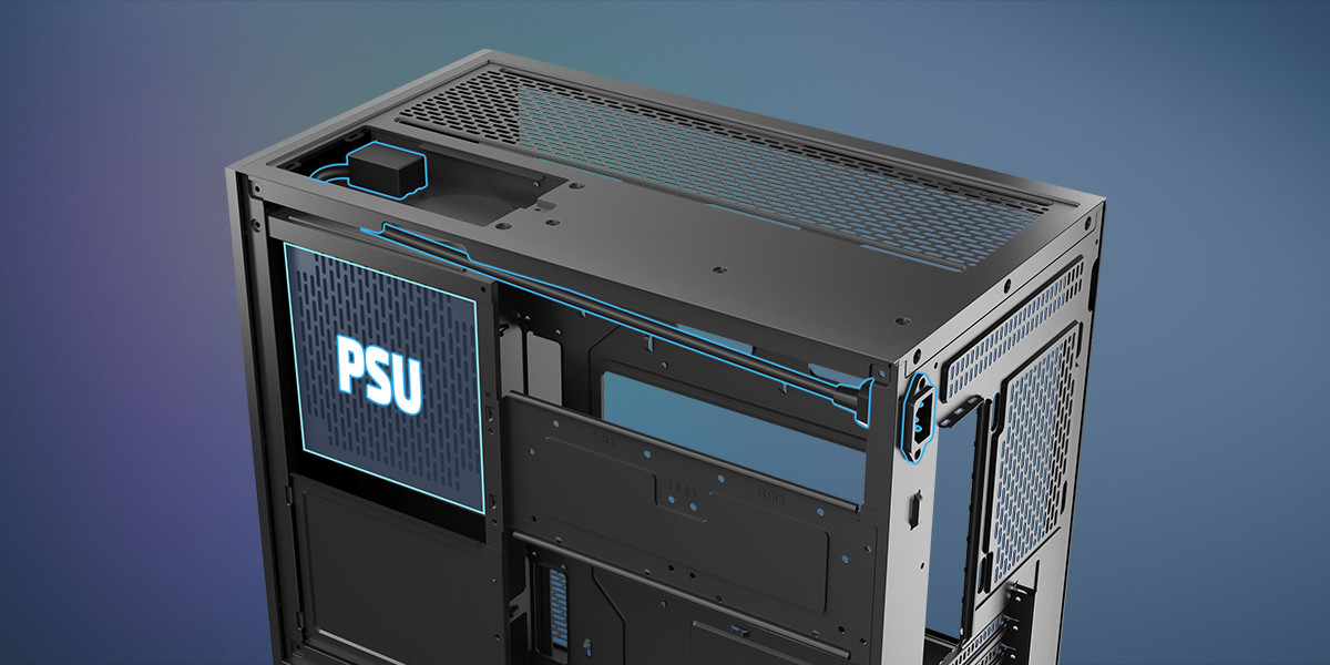 Dahili PSU güç uzatma kablosu sayesinde güç kaynağı ön tarafta konumlandırılabilirken, bağlantı arkadan yapılabilir. Daha düzenli ve estetik bir görünüm elde edilir.
