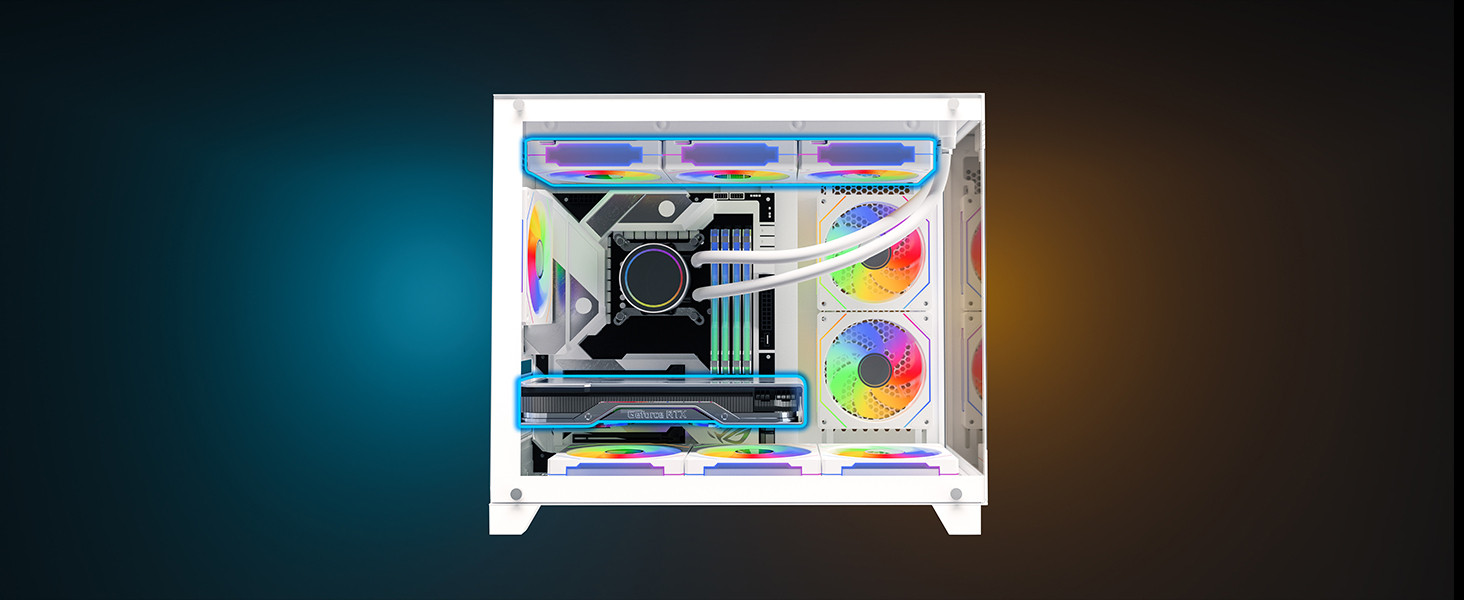 3 adet dahili ARGB infinity fan ile donatılmış Stark S700, 9x 120mm fana kadar destek sunar. Hava akışını en üst seviyeye çıkarın ve maksimum soğutma performansına ulaşın!
