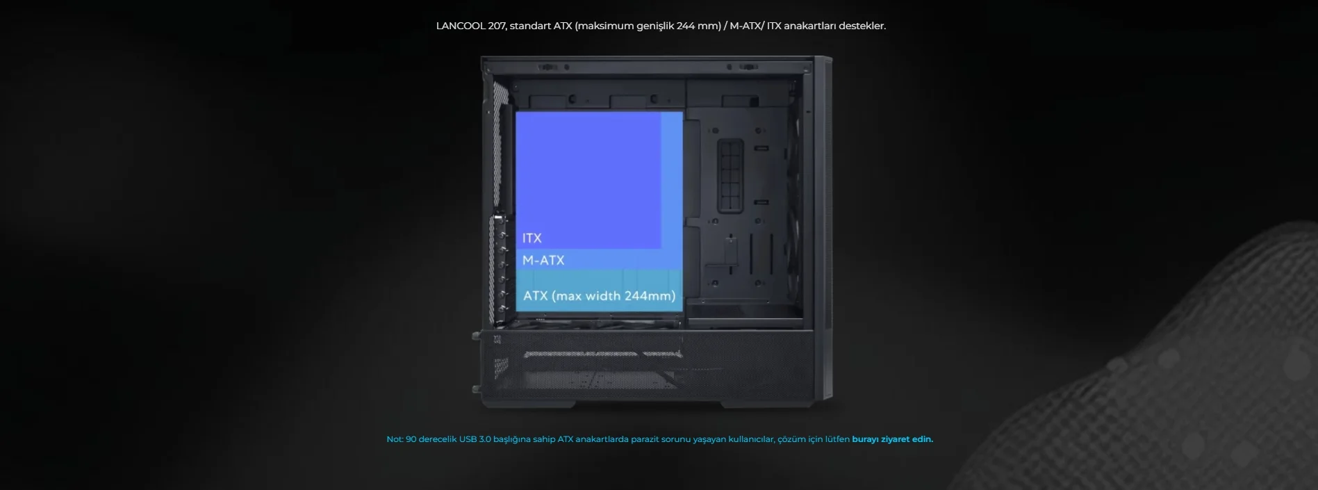 LANCOOL 207, standart ATX (maksimum genişlik 244 mm) / M-ATX/ ITX anakartları destekler.