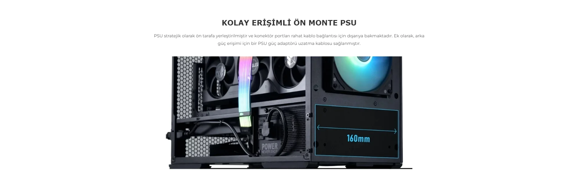 PSU stratejik olarak ön tarafa yerleştirilmiştir ve konektör portları rahat kablo bağlantısı için dışarıya bakmaktadır. Ek olarak, arka güç erişimi için bir PSU güç adaptörü uzatma kablosu sağlanmıştır.