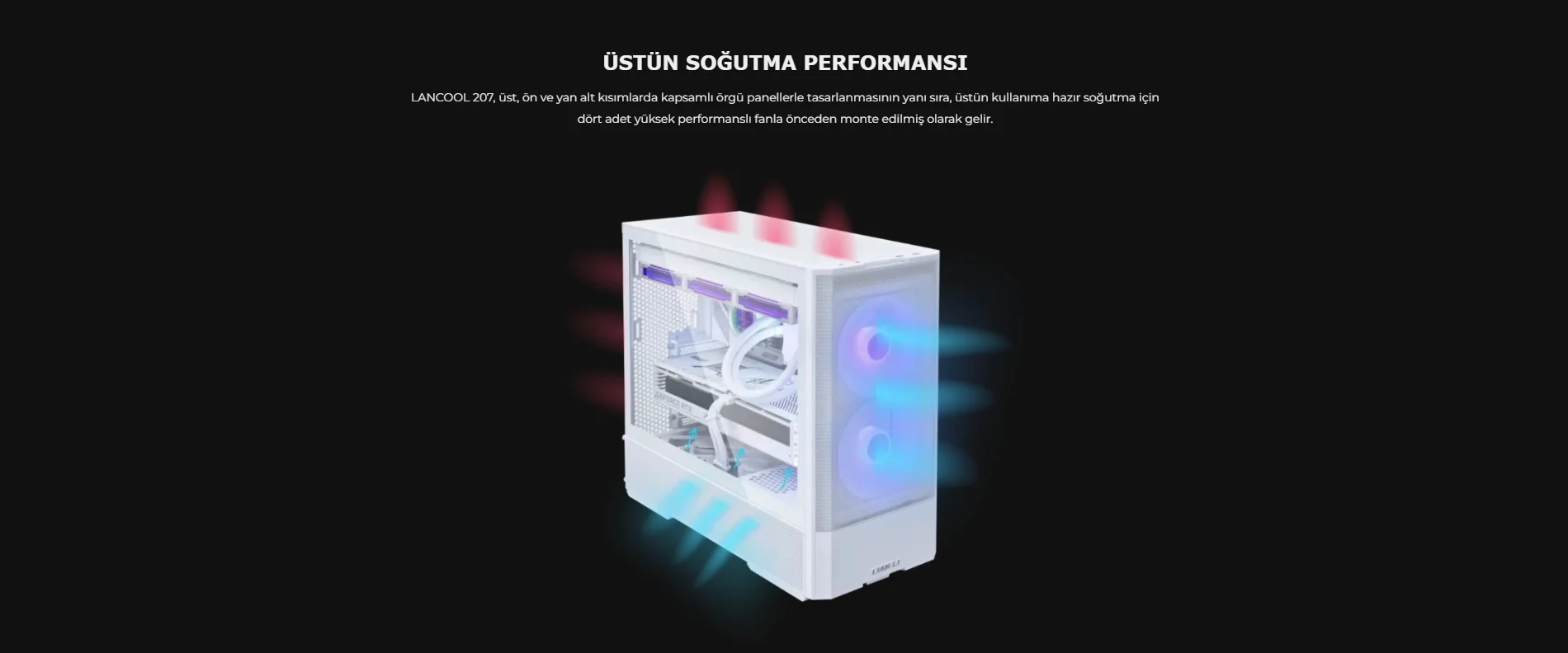LANCOOL 207, üst, ön ve yan alt kısımlarda kapsamlı örgü panellerle tasarlanmasının yanı sıra, üstün kullanıma hazır soğutma için dört adet yüksek performanslı fanla önceden monte edilmiş olarak gelir.