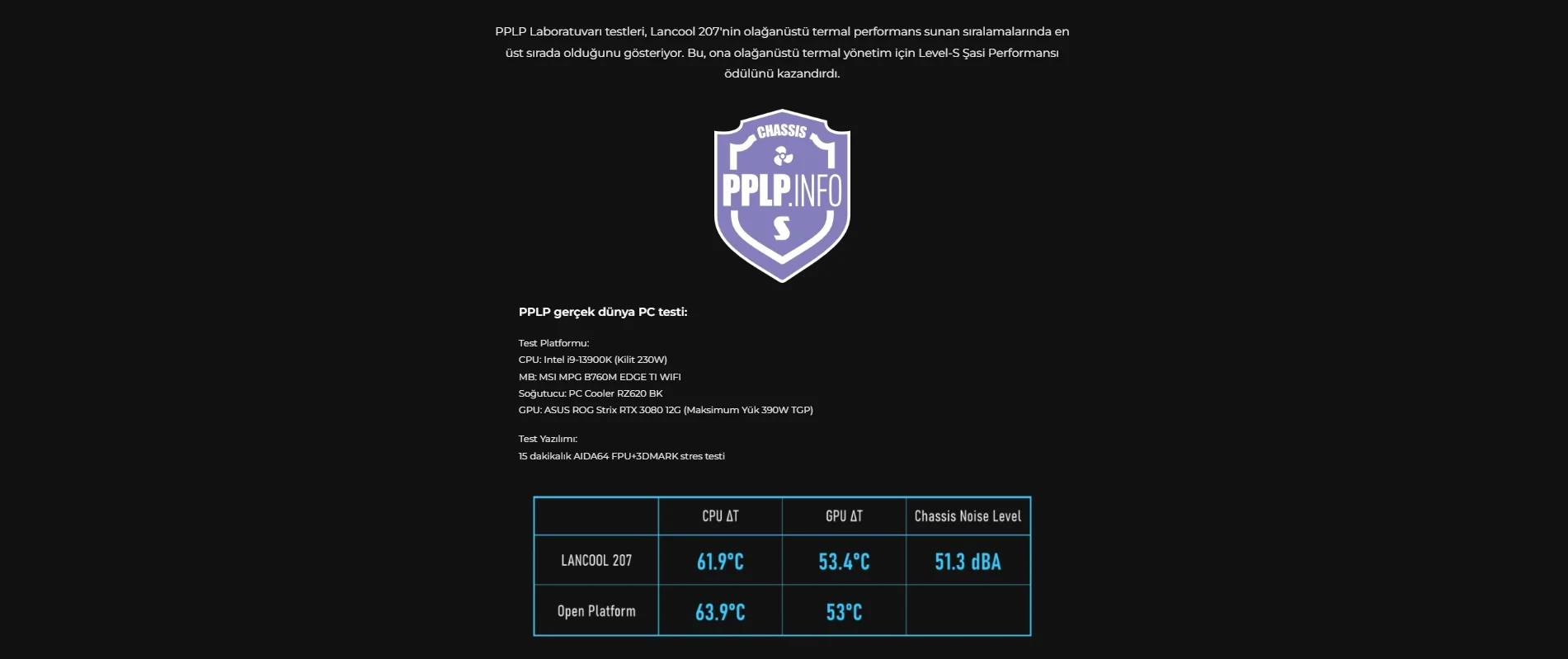 PPLP Laboratuvarı testleri, Lancool 207'nin olağanüstü termal performans sunan sıralamalarında en üst sırada olduğunu gösteriyor. Bu, ona olağanüstü termal yönetim için Level-S Şasi Performansı ödülünü kazandırdı.