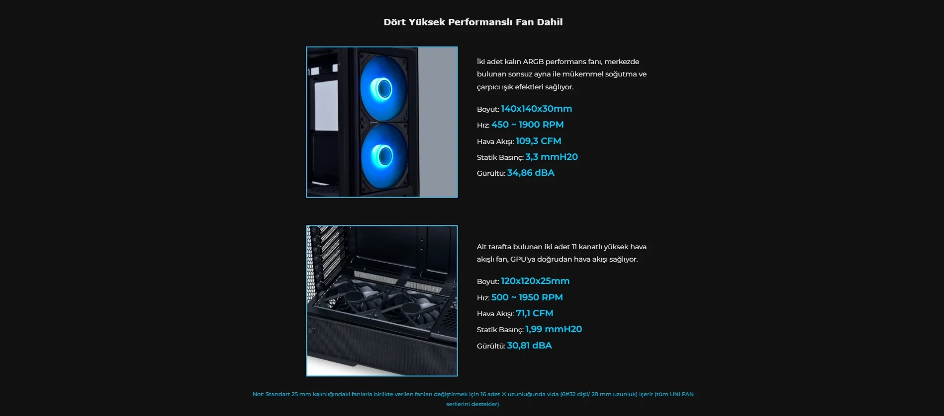 Dahili Fanlar Ön: 2 x 140 mm ARGB fan (450~1900 RPM / DC 12V, 0,4A / LED 5V, 0,7A / 109,3 CMF / 3,3 mm-H2O / 34,86 dB-A) - PSU Muhafazasının Üstü: 2 x 120 mm PWM fan (500~1950 RPM / DC 12V, 0,28A / 71,1 CMF / 1,99 mm-H2O / 30,81 dB-A)