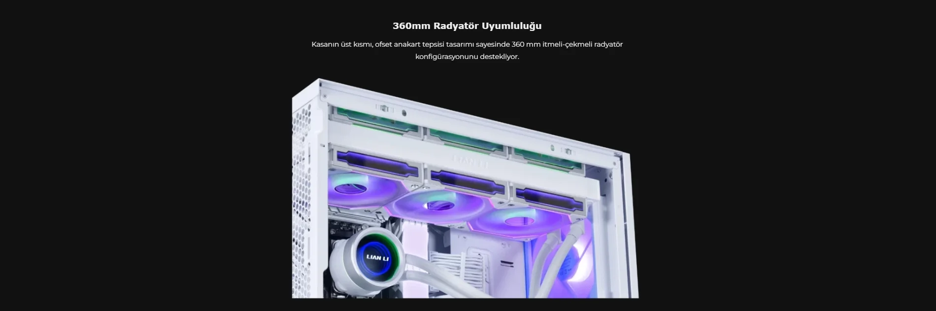 Kasanın üst kısmı, ofset anakart tepsisi tasarımı sayesinde 360 mm itmeli-çekmeli radyatör konfigürasyonunu destekliyor.