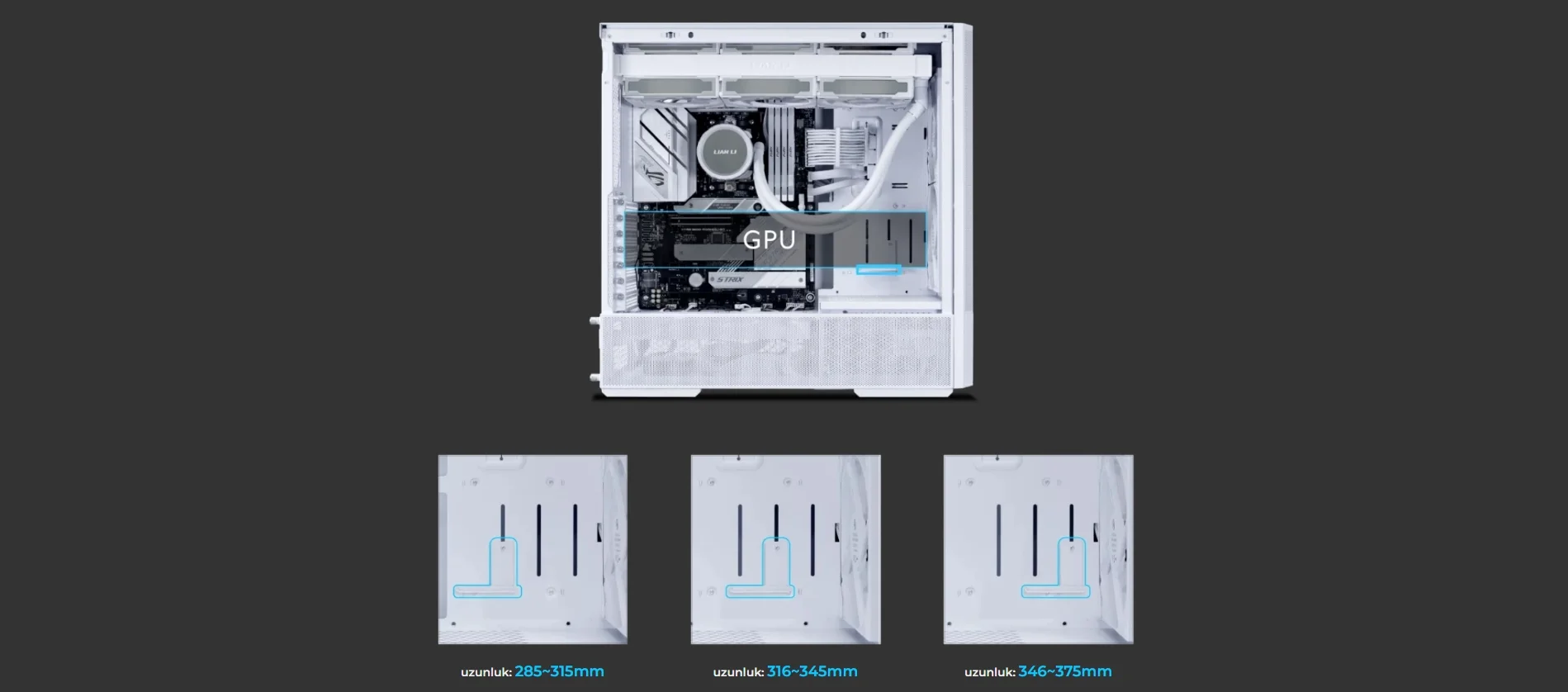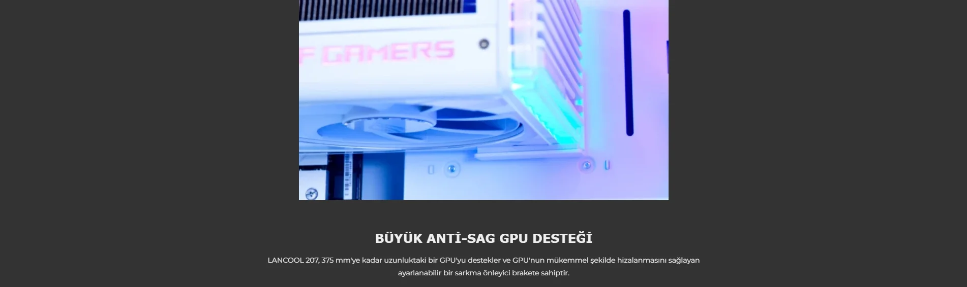 LANCOOL 207, 375 mm'ye kadar uzunluktaki bir GPU'yu destekler ve GPU'nun mükemmel şekilde hizalanmasını sağlayan ayarlanabilir bir sarkma önleyici brakete sahiptir.