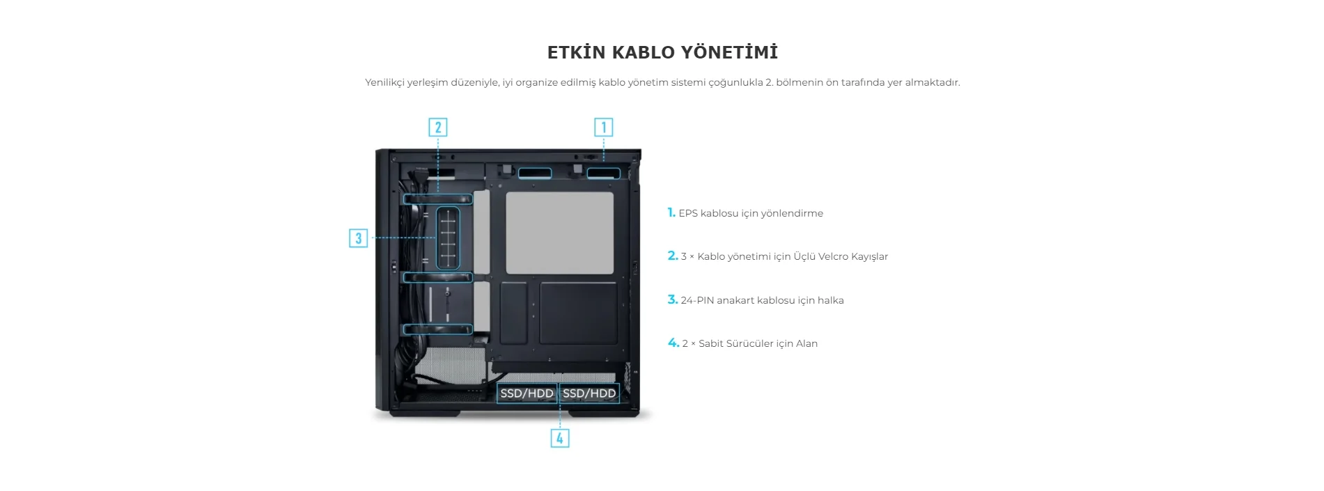 Yenilikçi yerleşim düzeniyle, iyi organize edilmiş kablo yönetim sistemi çoğunlukla 2. bölmenin ön tarafında yer almaktadır.