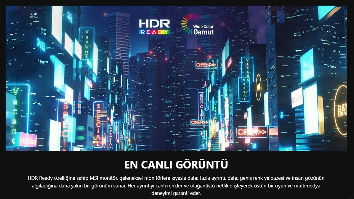 MSI MAG 244F monitör, sRGB %126, DCI-P3 %96 ve Adobe RGB %91 renk kapsamı ile oyunlarda gerçekçi ve canlı görseller sunar. HDR Ready desteği sayesinde karanlık sahnelerde bile ayrıntılar net bir şekilde görüntülenir. 1.07 milyar renk ve 10 bit renk derinliği, özellikle grafik ve video düzenleme gibi profesyonel işler için de üst düzey renk doğruluğu sağlar. Gelişmiş görüntü teknolojileri, kullanıcıya en üst seviye deneyim sunar.