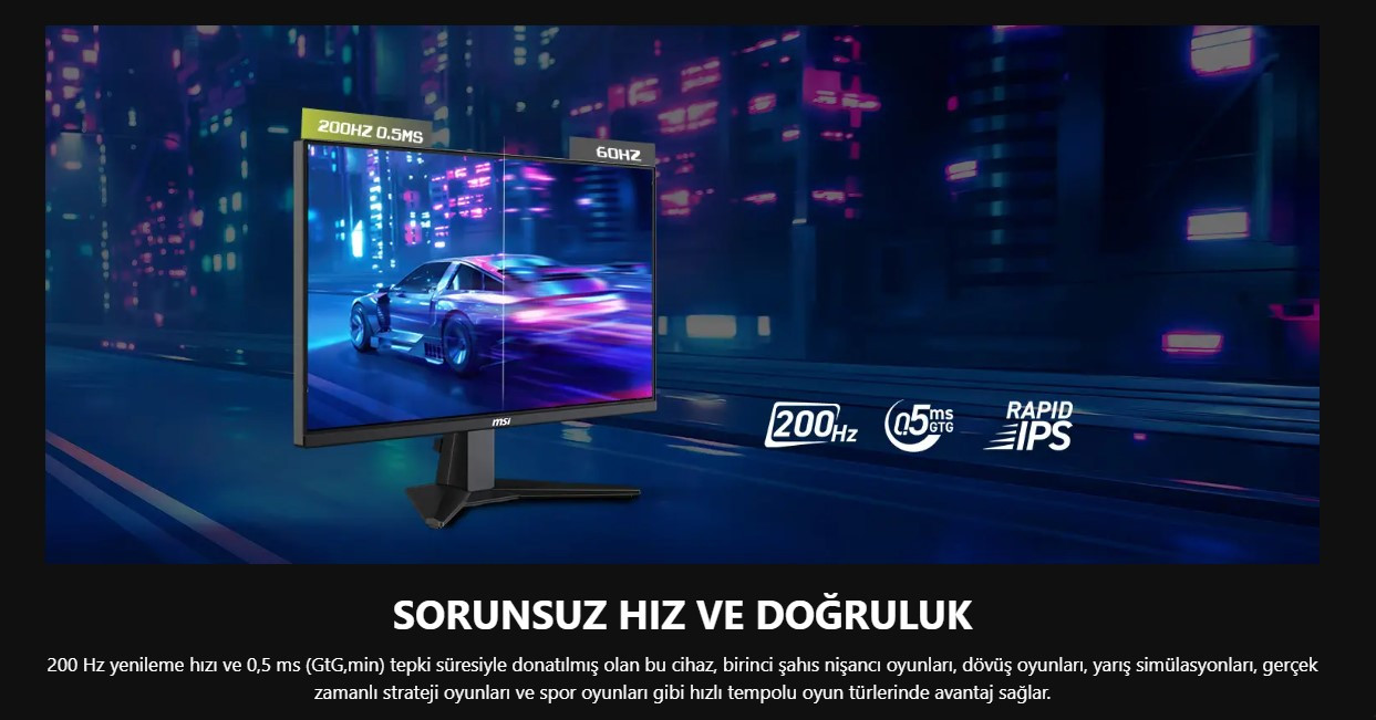 MSI MAG 244F monitör, 200 Hz yüksek yenileme hızı sayesinde hızlı aksiyon oyunlarında bile akıcı ve kesintisiz bir görüntü sunar. Bu özelliği ile rekabetçi oyuncular için mükemmel bir tercih olan bu monitör, ekran yırtılmalarını ve takılmaları en aza indirir. 0.5 ms GTG tepki süresi ile gecikmesiz bir oyun keyfi yaşanır. Yüksek yenileme hızı, profesyonel e-spor oyuncuları ve hız tutkunları için avantaj sağlar.