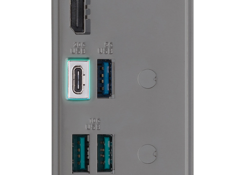 20Gbps’e varan aktarım hızlarına sahip arka USB Type-C®içeren çeşitli USB bağlantılarıyla çevre birimleriyle dolu son seviye sistemlere destek verir.