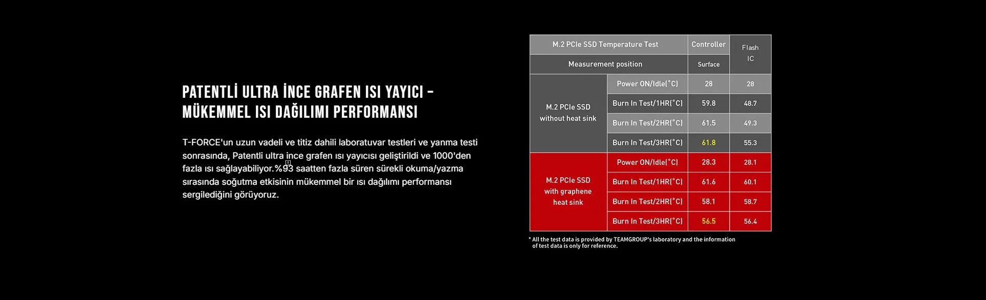 T-FORCE'un uzun vadeli ve titiz dahili laboratuvar testleri ve yanma testi sonrasında, Patentli ultra ince grafen ısı yayıcısı geliştirildi ve 1000'den fazla ısı sağlayabiliyor.%93 saatten fazla süren sürekli okuma/yazma sırasında soğutma etkisinin mükemmel bir ısı dağılımı performansı sergilediğini görüyoruz.