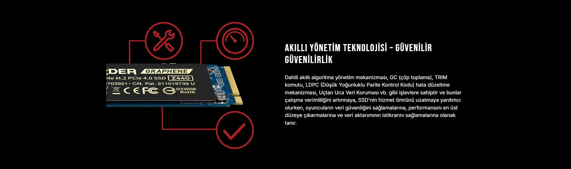 Dahili akıllı algoritma yönetim mekanizması, GC (çöp toplama), TRIM komutu, LDPC (Düşük Yoğunluklu Parite Kontrol Kodu) hata düzeltme mekanizması, Uçtan Uca Veri Koruması vb. gibi işlevlere sahiptir ve bunlar çalışma verimliliğini artırmaya, SSD'nin hizmet ömrünü uzatmaya yardımcı olurken, oyuncuların veri güvenliğini sağlamalarına, performansını en üst düzeye çıkarmalarına ve veri aktarımının istikrarını sağlamalarına olanak tanır.Teknik Özellikler