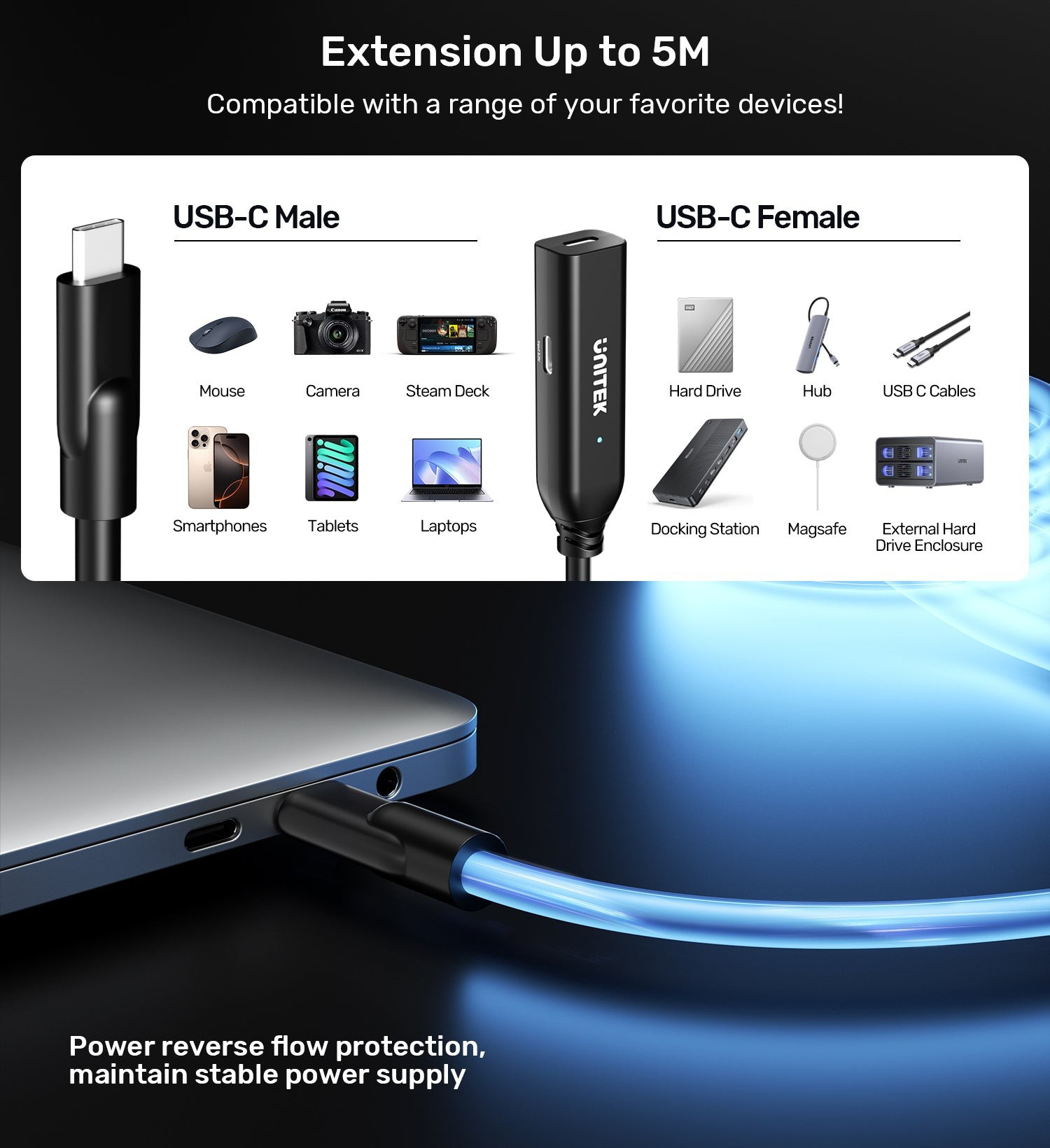 Unitek USB-C uzatma kablosu, 5 metreye kadar erişim sağlar ve 10Gbps (USB 3.2 Gen 2) veri aktarımını destekler — 10GB’lık bir dosyayı 10–20 saniyede taşıyabilirsiniz. Dahili sinyal güçlendiriciler, alt cihazlar için DC 5.0V USB-C güç girişi ve ters güç akışı koruması ile MacBook, iPad, Steam Deck ve daha birçok cihaz için kararlı, uzun mesafeli bağlantı sunar.