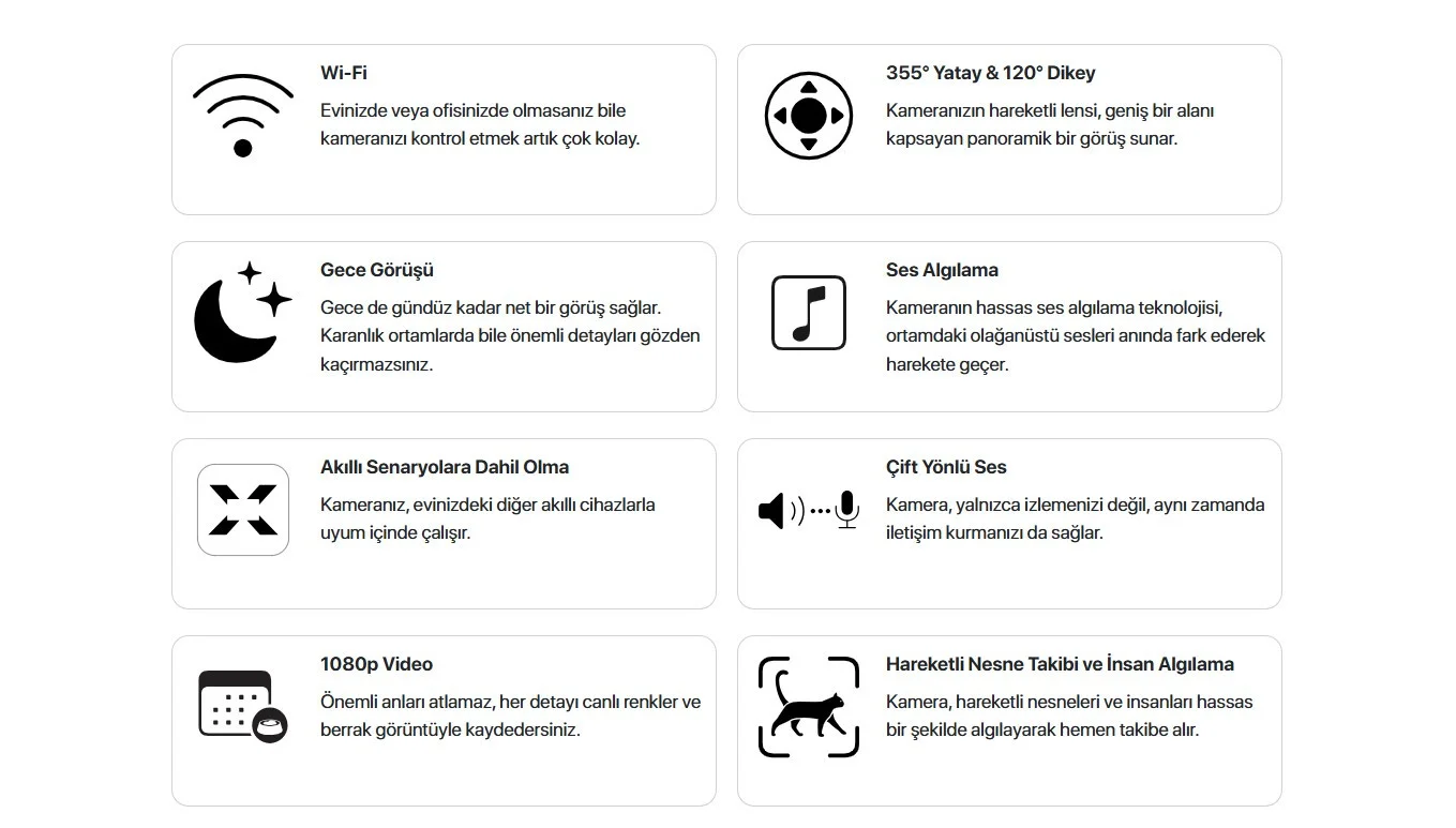 | Ürün Özelliği | Uygulama ile Kontrol, SD Kart/ Cloud Depolama, Hareket Algılama, Ses Algılama |